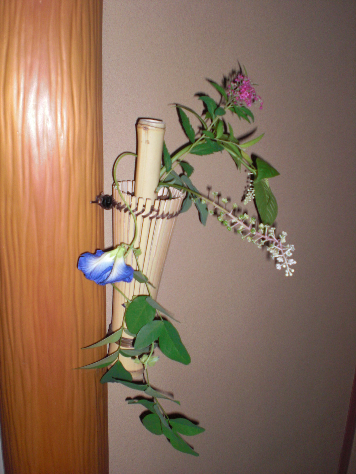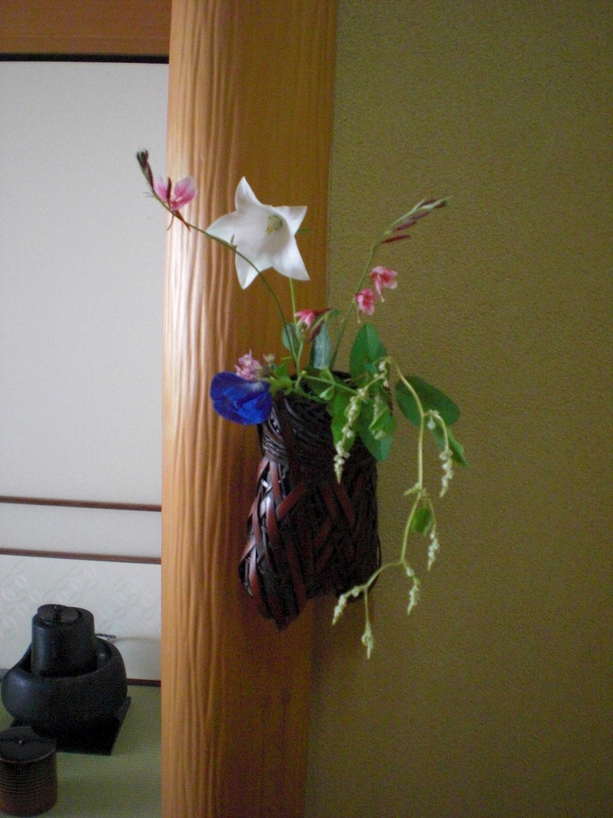 連日の雨で、床に入れる花があるかしら・・・と心配しましたが、何とか5種類間に合いました。