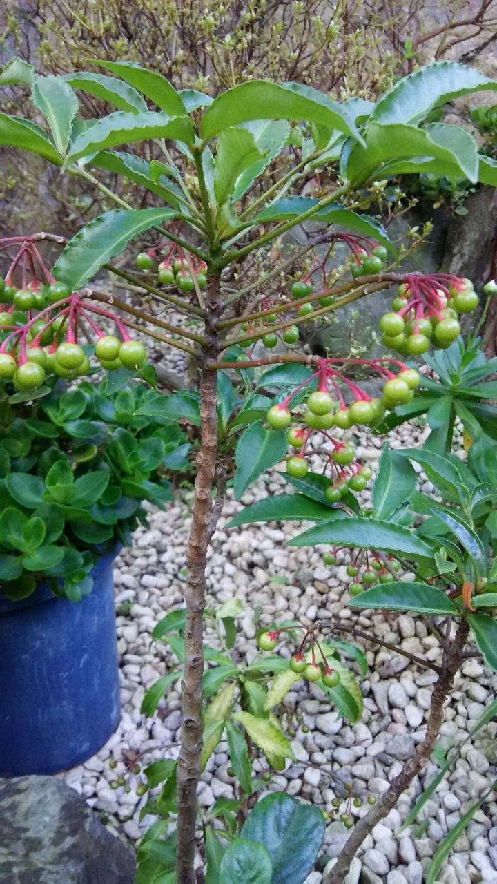 冬に綺麗な赤い実を見せてくれる『万両』は今はまだ実じたいは青いですが、実を付けている小枝から赤くなってきていて、冬に見るはっきりとした万両の色彩と又違って、とても新鮮で可愛いです。