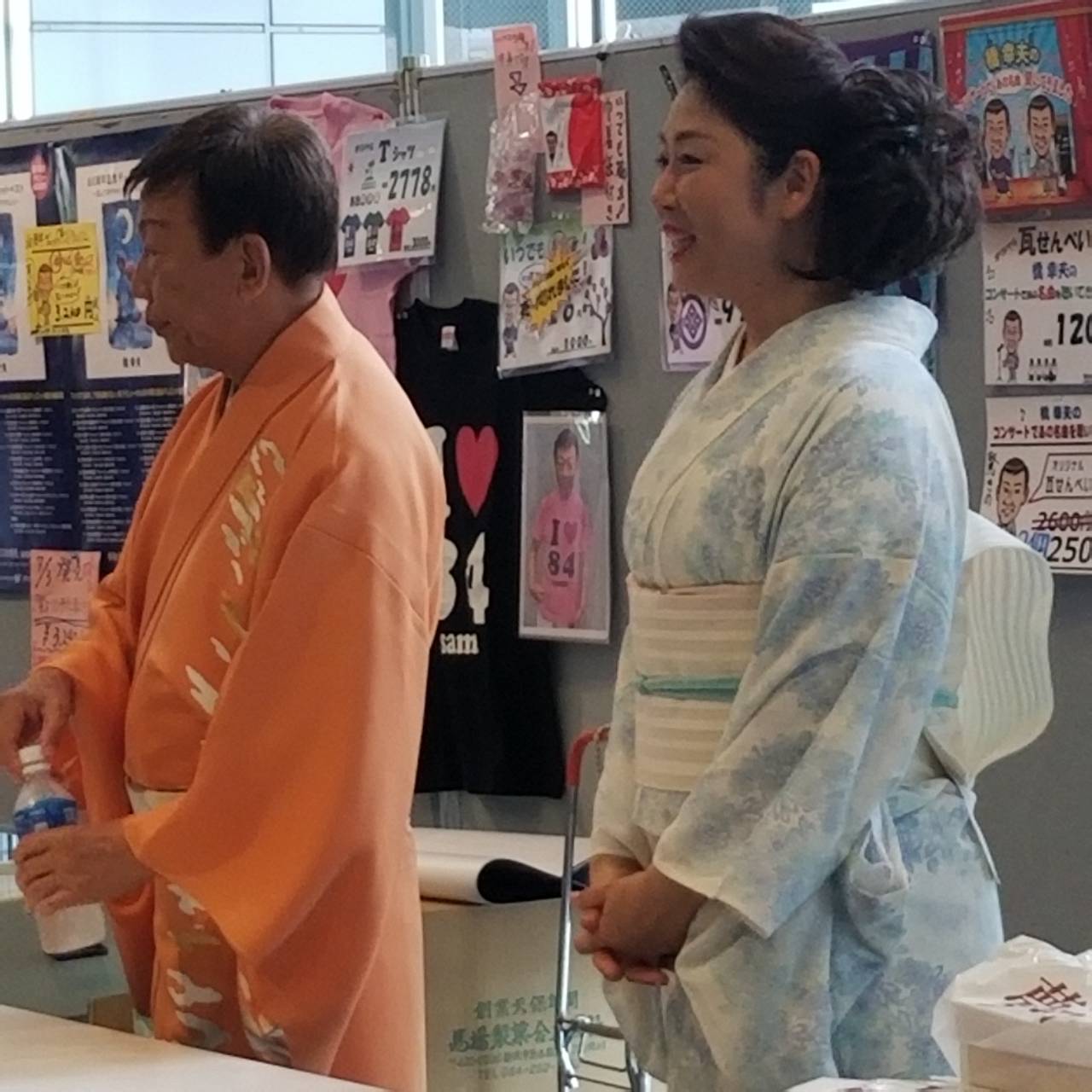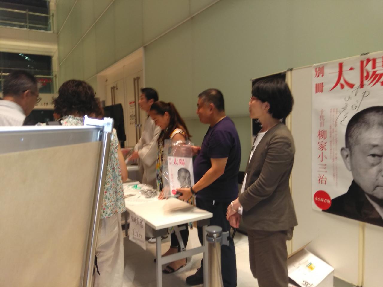 舞台終了後、お着換えをされたのか、DVDの販売をされている、三三さんは、涼しそうな、白地縮の着物を着流しでお召しでした。