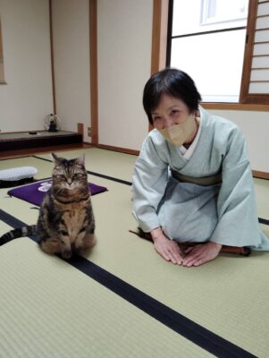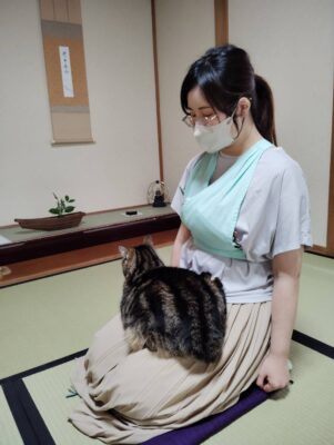 午後から、一緒にお稽古に加わったのですが、私の膝を上り下りした後、猫大好きなIさんの膝を攻略したのです。