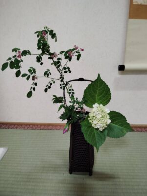 庭の花も梅雨らしく紫陽花が中心で、、今日は私のお気に入りの四葩が咲いてくれて使う事が出来ました。